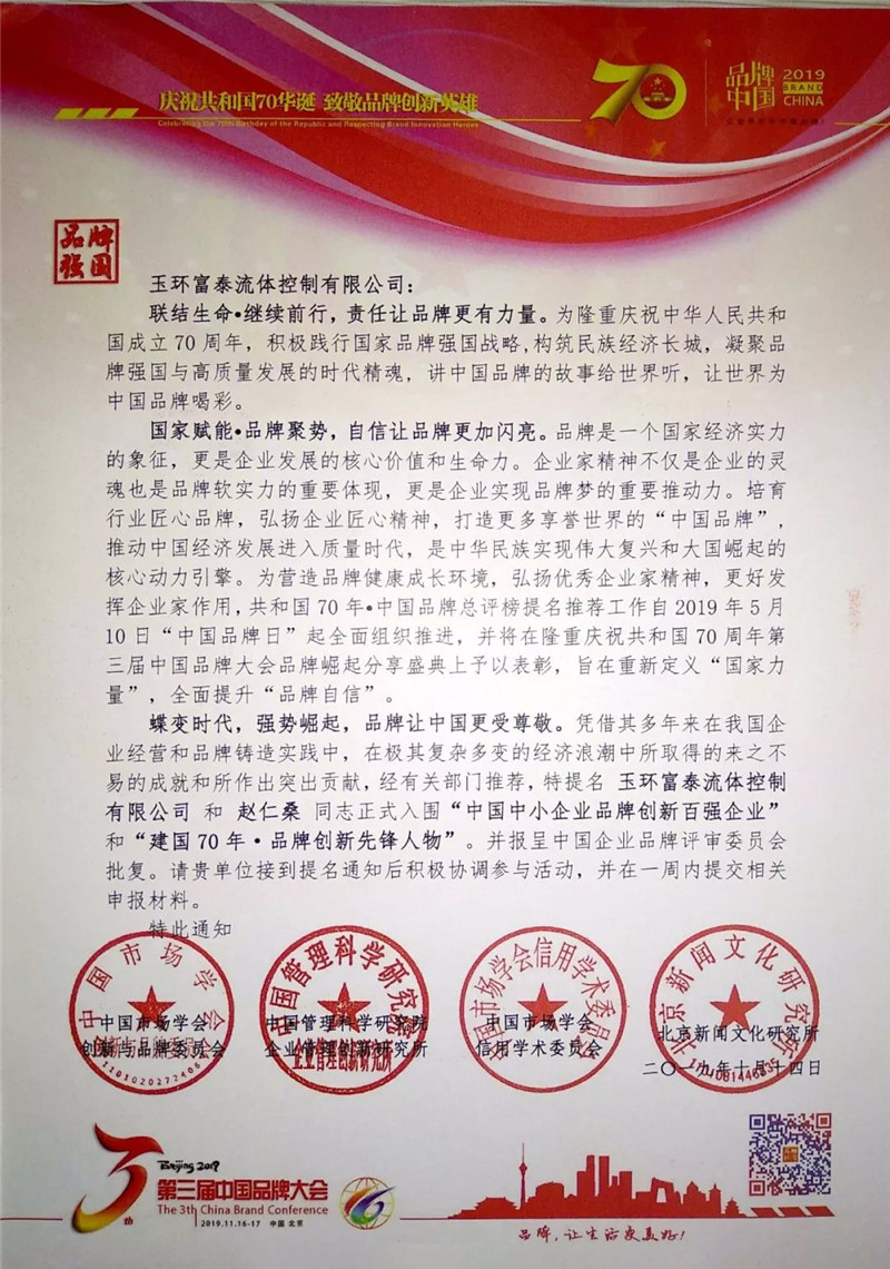 继2018年,千亿qy88国际官网入口获得CCTV中国优选品牌的荣誉称号之后,2019年,我们还收获了“中国中小企业品牌创新百强企业”的提名,“浙江省科技型企业认证”等多项殊荣,总经理赵仁桑亦获得了“建国70年·品牌创新先锋人物”的正式提名。种种荣耀,是对千亿qy88国际官网入口品牌最大的肯定,我们将会继续努力,争做行业领先者!